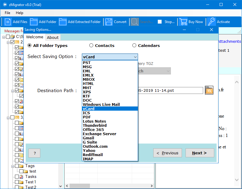 5. A ‘Saving Options’ window appears. In this window, you have to explore the menu of ‘Select Saving Option’. Select vCard from the menu.