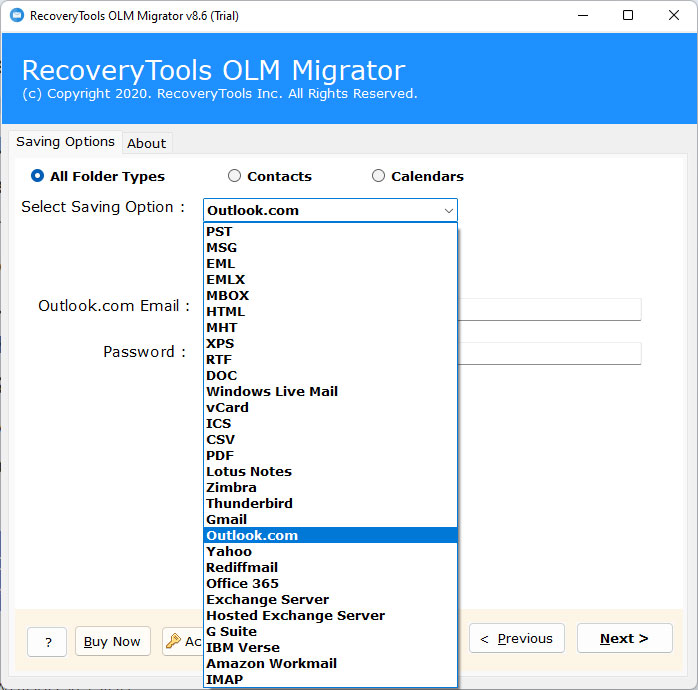 Note: The free edition allows you to export only a few emails from OLM to Hotmail account directly. For more and unlimited migration, you need to buy this product for lifetime use.