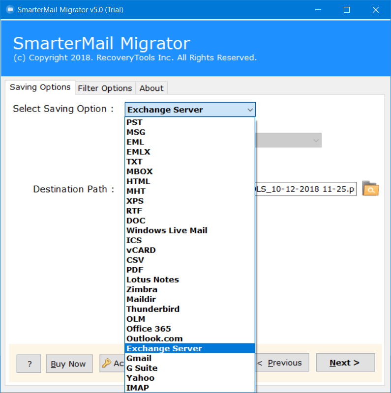 - Select Exchange Server option from the list of 20+ Select Saving options.