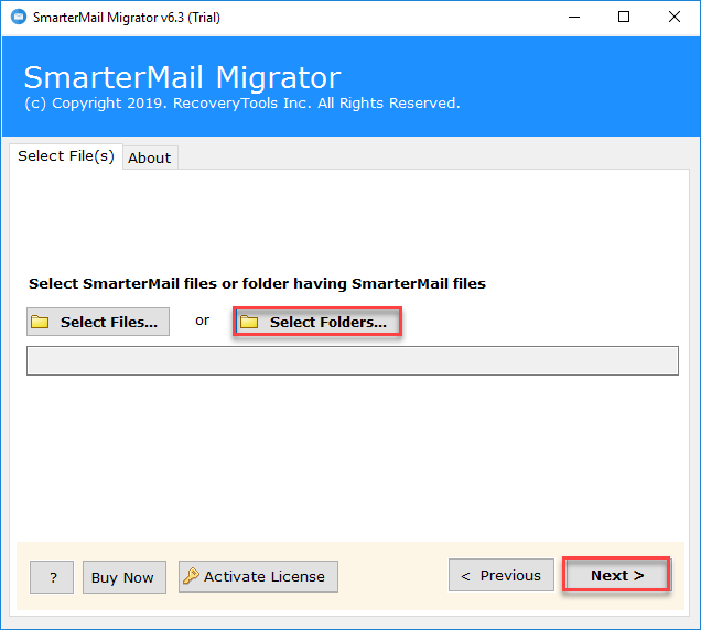 1. Upload the SmarterMail mailbox with different user data by choosing the Select Folder option.